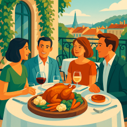 * Peter peut alors profiter du dîner avec ses amis à La Villa Borgo - Hôtel Restaurant Champagne-au-Mont-d'Or !